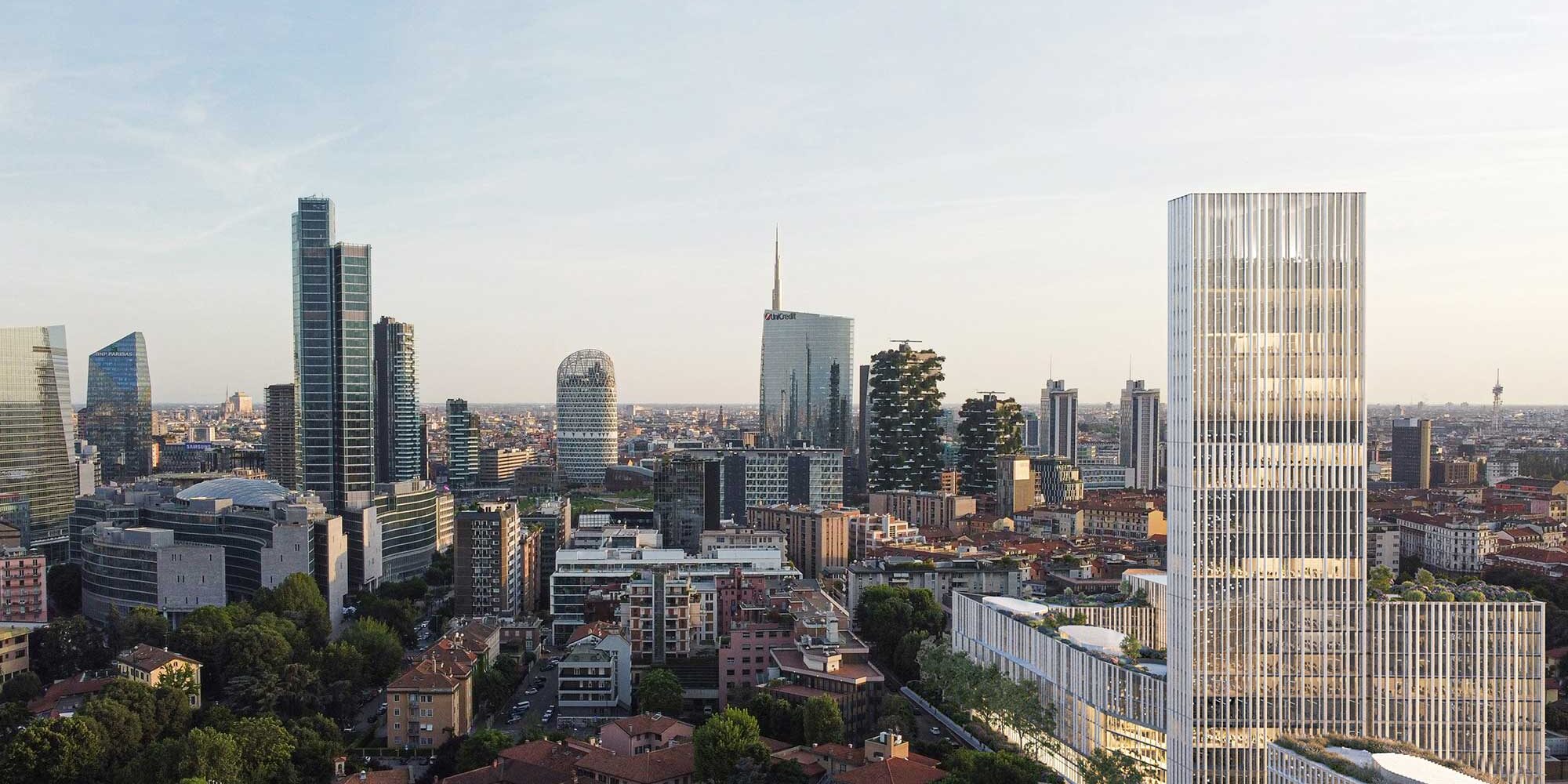 Arising from a horizontal urban dimension, the architectural complex culminates with a 26-storey tower overlooking Via Rosellini.The vertical development is emphasised by a backbone consisting of double-and triple-height green terraces visible from the outside thanks to modular panels of photovoltaic glass, which eventually finds its expression ina large garden on the roof of the low body.