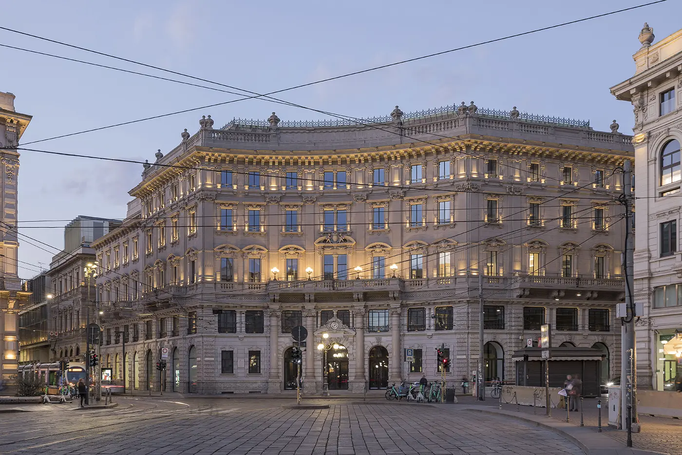 Palazzo Broggi, with the superb concave façades of three other majestic Neo-Renaissance buildings, or “twin palaces,” forms the particularly striking and theatrical layout of Piazza Cordusio’s urban plan — an elliptical hub of six radial streets, once the financial center of Milan and now a vibrant focal point of the city’s social and commercial life.